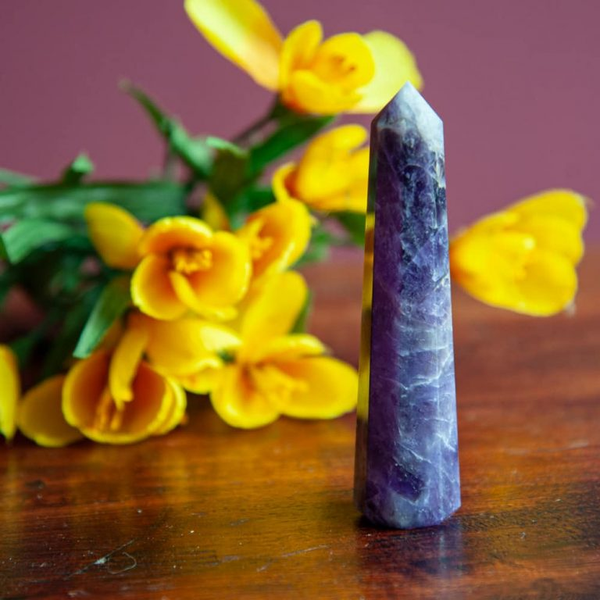 Een edelsteen obelisk van circa 10 – 13 cm hoog in Amethist.