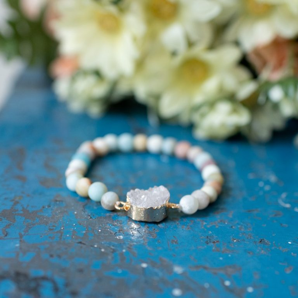 Een mooie armband met Amazoniet kralen van circa 6mm. Deze armband is uniek, want hij bevat daarnaast ook een mini kwarts cluster.