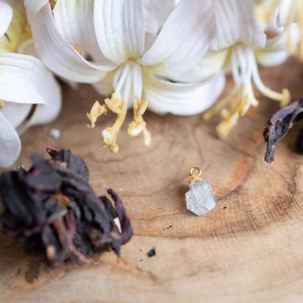 Een prachtige handgemaakte geboortesteen hanger met ruwe Herkimer Diamant edelsteen. De sieraden smid uit India besteedt veel aandacht aan elke hanger. Er wordt alleen gebruik gemaakt van de mooiste stukken Herkimer Diamant. Doordat de edelsteen een natuur product is, heb je altijd een unieke hanger. De afmeting van de edelstenen is ongeveer 10 – 14 mm. De hanger is gemaakt van een koper / messing samenstelling. De hanger is daarnaast verguld (klein laagje goud).