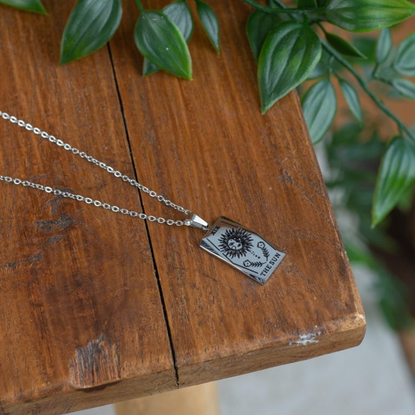 Een zilverkleurige hanger met Tarot ‘de Zon’ amulet gemaakt van roestvrij Staal. De hanger is 24 x 14 mm groot en hangt aan een verstelbare metalen ketting van 45-50 cm.